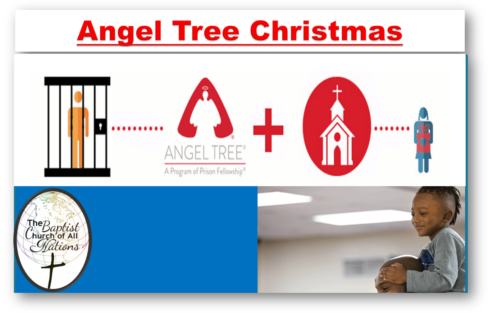 Angel Tree Christmas™ equips churches and other organizations to restore and strengthen relationships between incarcerated parents and their children and families. Every Christmas, Angel Tree mobilizes local churches and organizations to minister to hundreds of thousands of children by delivering a gift, the Gospel message, and a personal message of love on behalf of their mom or dad behind bars. In addition, many of our partner churches meet the physical, emotional, and spiritual needs of prisoners’ families by enfolding them in the day-to-day life of the church, helping children attend summer camp, and facilitating mentorship. If you would like more information about Angel Tree Christmas then please see the Prison Fellowship Ministry website.