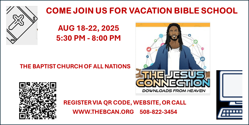 BCAN’s VBS 2025! Get ready for an unforgettable and enriching experience at BCAN’s Vacation Bible School 2025! Join us as we embark on a journey of faith, fun, and discovery. You will experience an exciting time of activities, engaging lessons, and meaningful stories from the Bible that will equip and edify regardless of age. From fun crafts to lively songs and interactive games, there will be something for everyone to enjoy. Come and be a part of this wonderful opportunity to strengthen your faith and create lasting memories – and maybe make a friend or two š